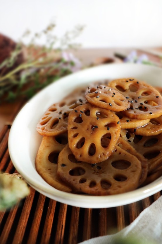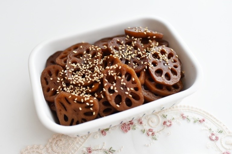 - 완성된 연근조림 위에 통깨나 잣 등을 뿌려 장식하면 됩니다.