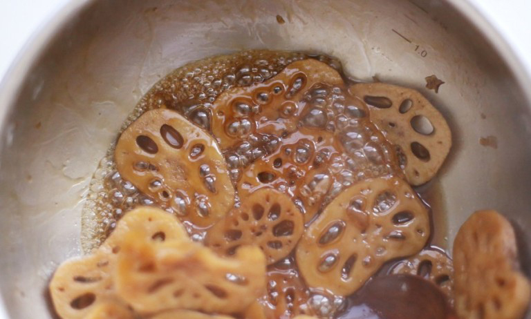- 중불에서 양념이 끓으면 썰어 둔 연근을 넣고 졸입니다.