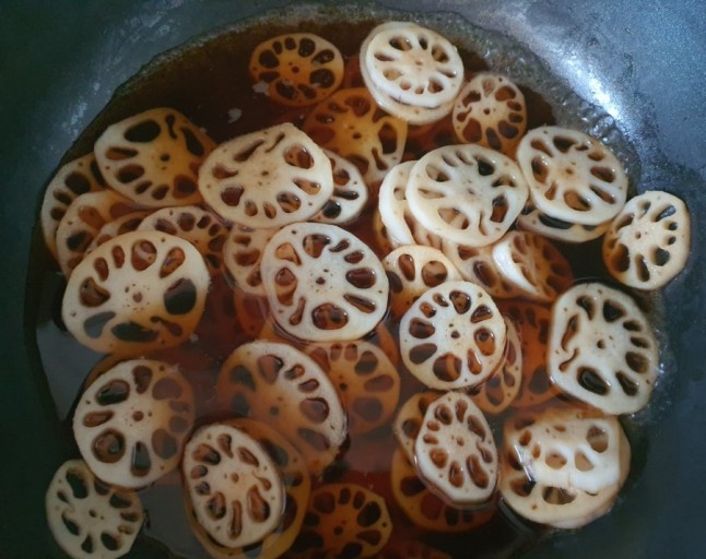 - 팬에 식용유를 두르고 연근을 기름이 거의 보이지 않을 때까지 볶습니다(약간 아삭하게).