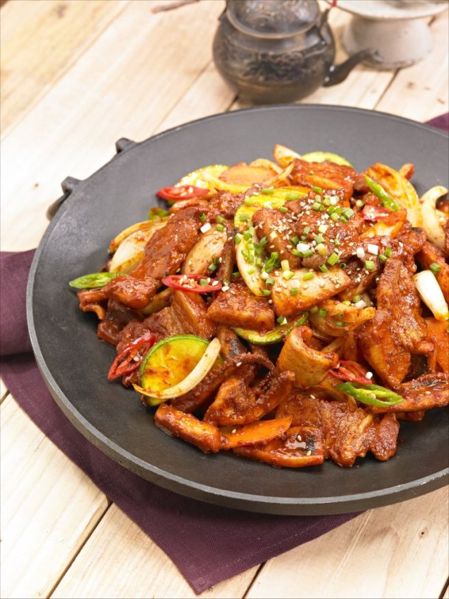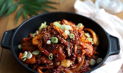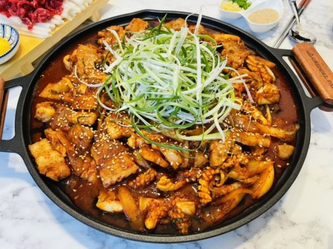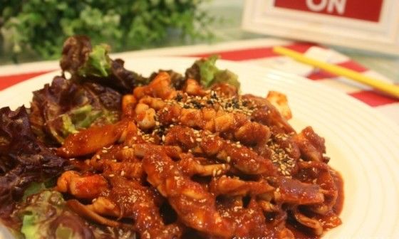 재료; 돼지 앞다리, 오징어, 냉이, 당근, 양파, 파, 마늘, 팽이 버섯, 고추장, 간장, 참기름, 물엿, 후춧가루, 깨소금