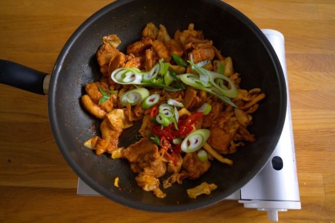 - 고기를 먼저 타지 않게 중불에서 볶다가 거의 익어가면 오징어, 냉이, 파를 마저 넣고 익혀요.