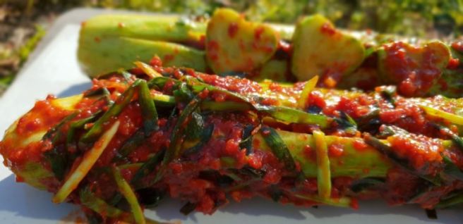 - 준비된 양념을 오이 속에 차곡차곡 넣고 살짝 눌러줍니다