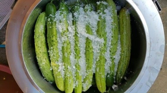 - 천일염에 오이가 상처가 나지 않도록 조심해서 살살 위아래 자리를 바꿔줍니다.