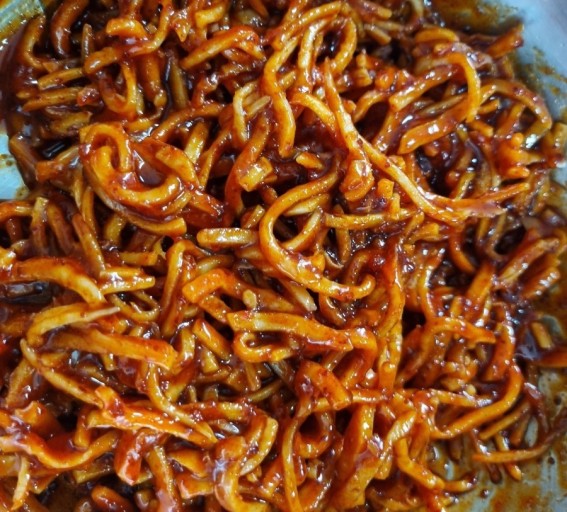- 불을 끄고 양념장을 팬에 붓고, 볶아낸 오징어채를 넣어 잘 섞습니다