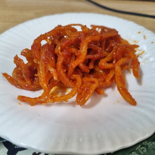 - 오징어채를 먹기 좋은 크기로 자릅니다.