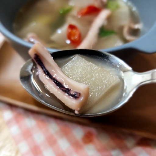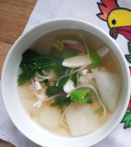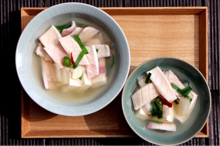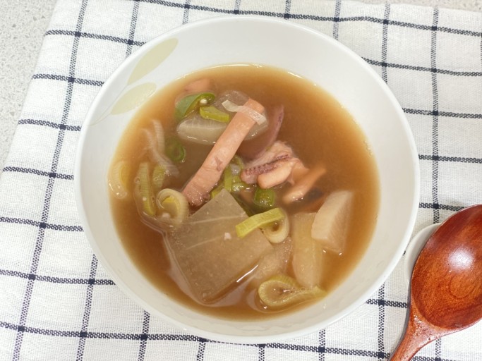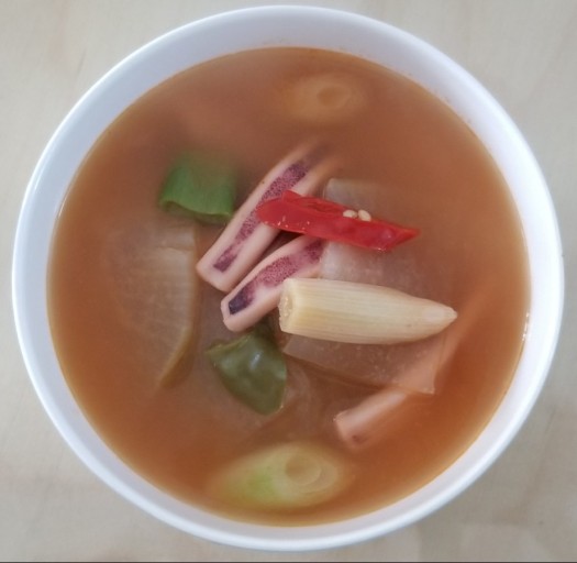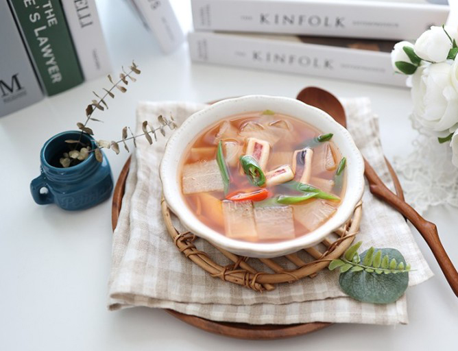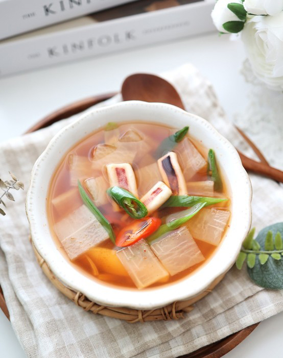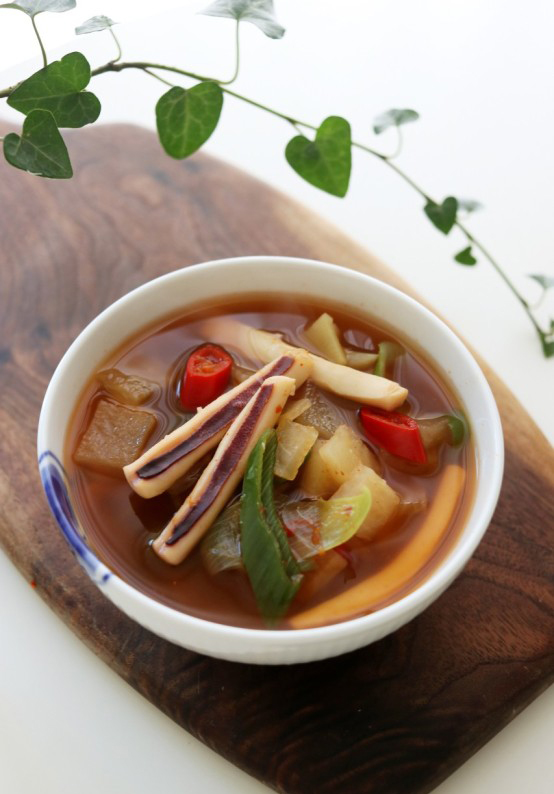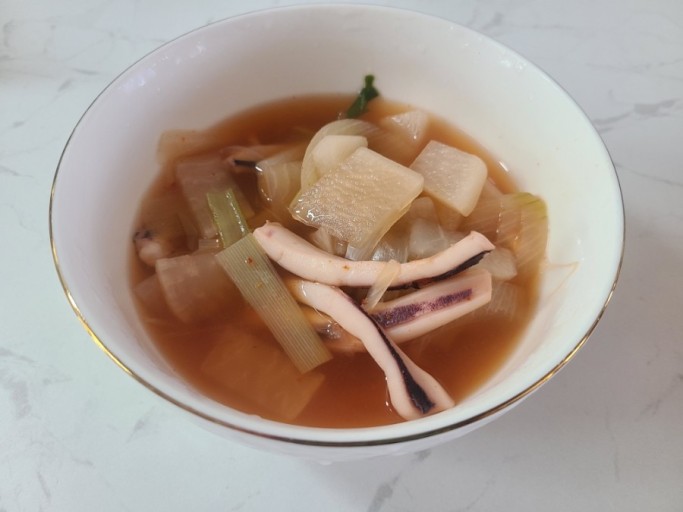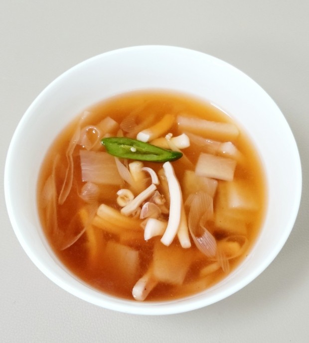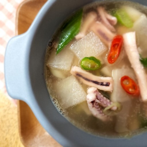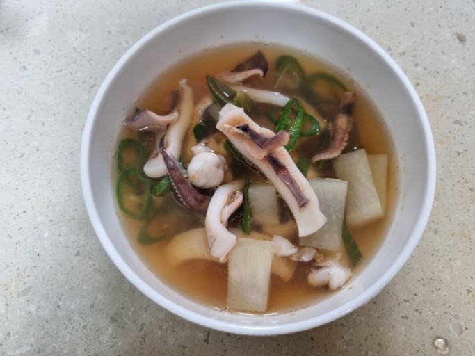- 그릇에 무와 오징어를 담고 국물을 부어 완성합니다.