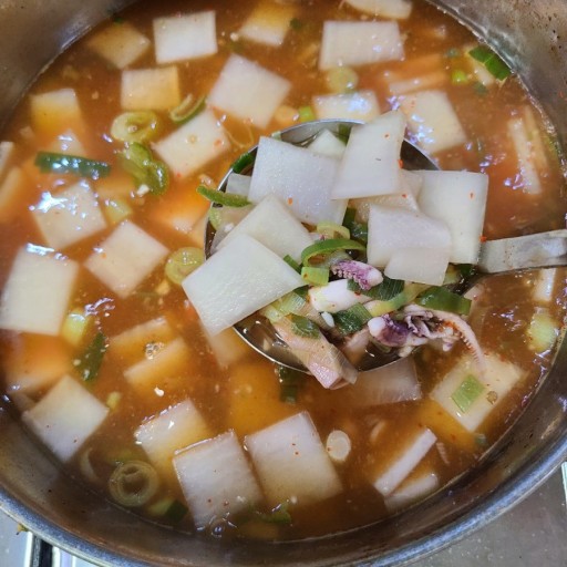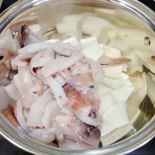 - 무가 익으면 오징어를 넣고 5분간 더 끓입니다.