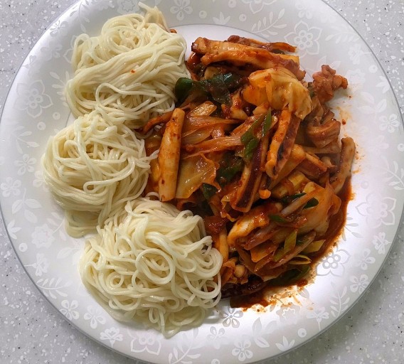 기호에 따라 소면을 삶아 오징어볶음과 함께 비벼 먹거나, 밥에 얹어 덮밥으로 즐겨도 좋다.
