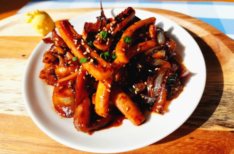 오징어 넣고 볶기:오징어를 넣고 볶은 후, 감자전분 1스푼, 참기름 1스푼, 통깨 1스푼으로 마무리한다.