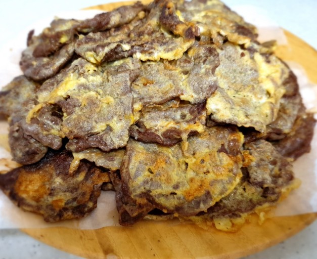 재료 : 소고기 전감, 후추, 소금, 계란, 튀김가루 1, 부침가루 3, 맛술 1, 식용유