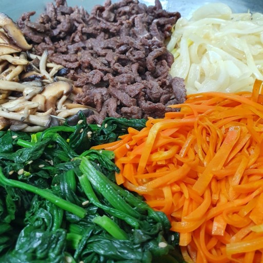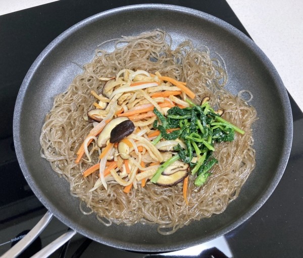 - 가스불 끈 상태이다. 볶아놓은 당면에 넓은 접시에 식혀 놓았던 부재료들을 다 넣고 깨소금 1숟, 참기름 1숟 넣고 섞으면 완성돼요.