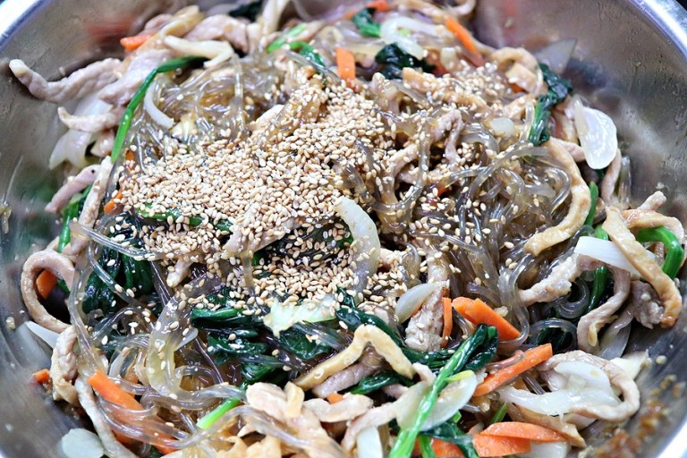 - 통깨를 뿌리고 한 번 더 섞어주면 맛있는 잡채가 완성됩니다.