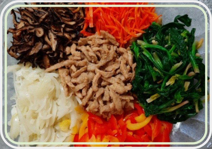 - 야채(양파, 당근, 목이버섯, 표고버섯)는 채 썰고, 시금치는 데쳐서 물기를 제거합니다.