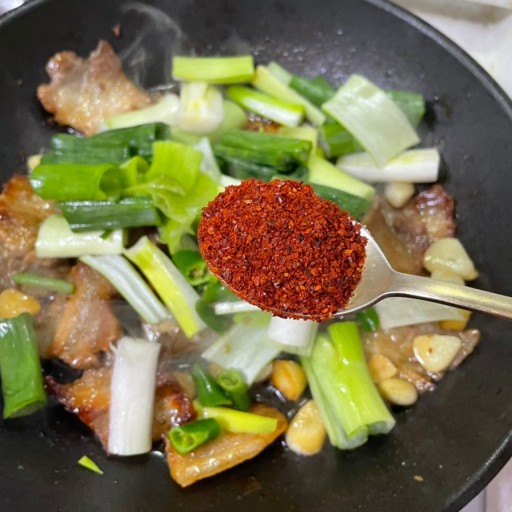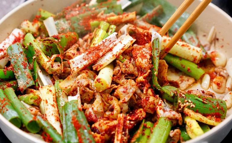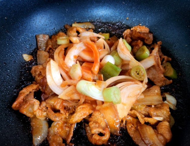 - 고기가 반쯤 익으면 채 썬 양파, 대파, 청양고추를 넣고 함께 빠르게 볶습니다.