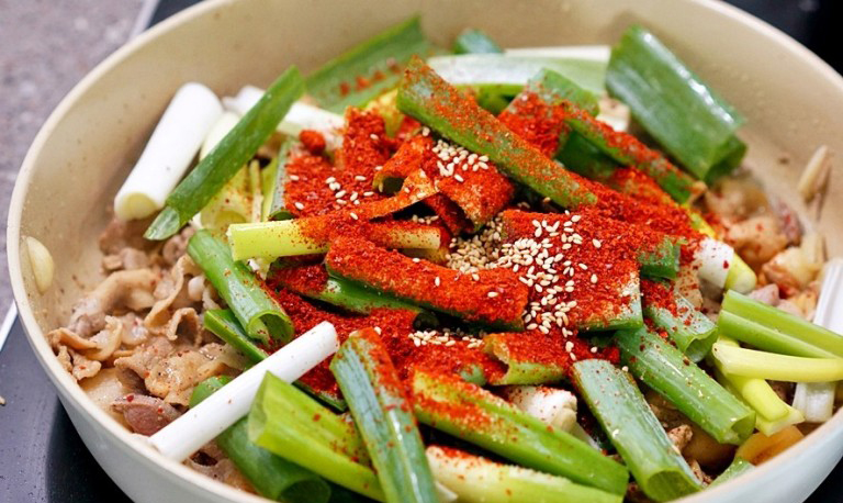 - 고기가 익으면 양배추. 홍고추. 청양고추. 대파를 넣고 볶다가 양배추의 숨이 죽으면 참기름 약간과 깨를 뿌려주면 완성입니다. 밥 위에 곁들여서 드시면 됩니다.