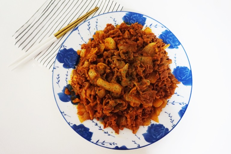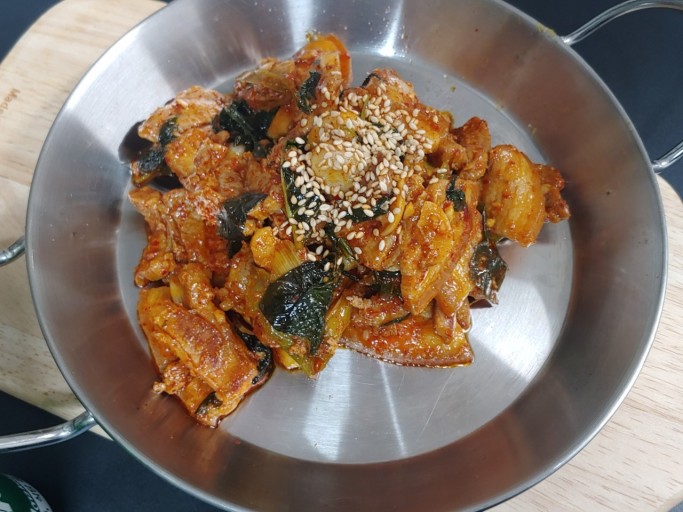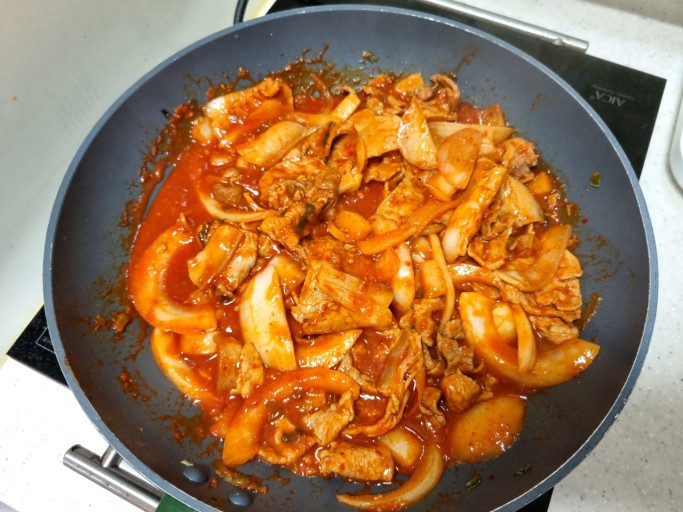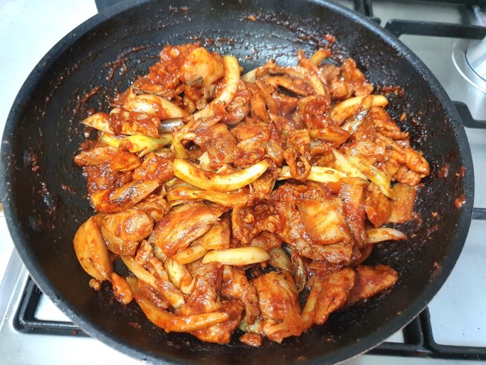 - 바싹 구운 고기 위에 나머지 야채와 양념을 넣고 복아내는 데 나눠서 조리할 그럴 경우 다 넣으면 안 되겠지요. 분량에 맞는 양의 야채와 양념물만 부어주시면 됩니다. 한 번에 다 볶을 경우는 다 넣어주면 되겠습니다.