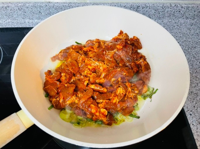 - 달군 팬에 제육 양념 고기만 올린다. 바로 뒤적거리지 말고 펼쳐서 중불에서 2분간 그대로 둡니다. 바닥이 살짝 누르면