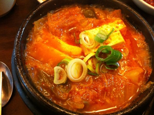 - 5분 정도 보글보글 끓여주세요 두부 한 모를 넣어준 후색감과 칼칼함을 위해청양고추 1개와 대파를 어슷 썰어 넣고