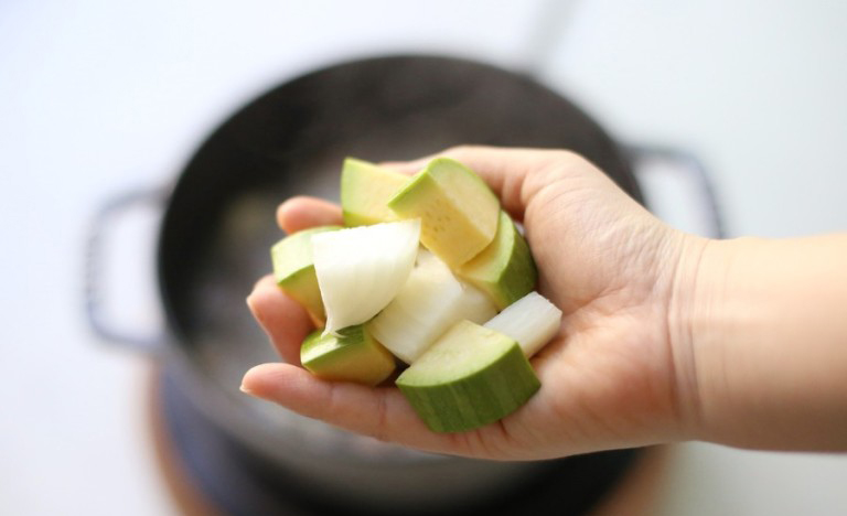 - 무, 양파, 애호박, 대파, 청양고추, 홍고추를 넣고 살짝 볶아줍니다.