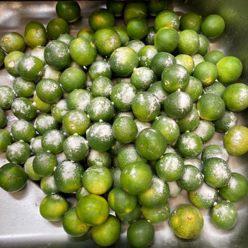 따뜻한 물에 베이킹소다를 풀어 청귤을 30분에서 1시간 정도 담가둔다.