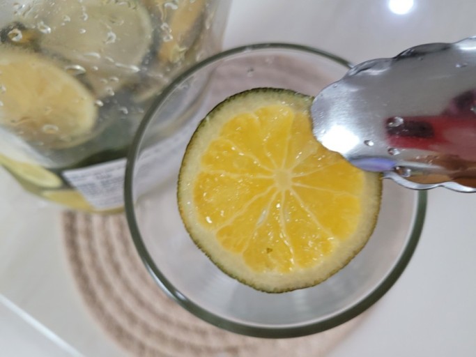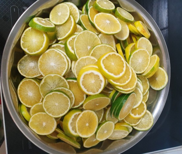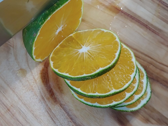 청귤은 얇은 슬라이스 느낌이 들게 자르는데, 두께는 2mm 내외로 잘라 주는 것이 좋다.