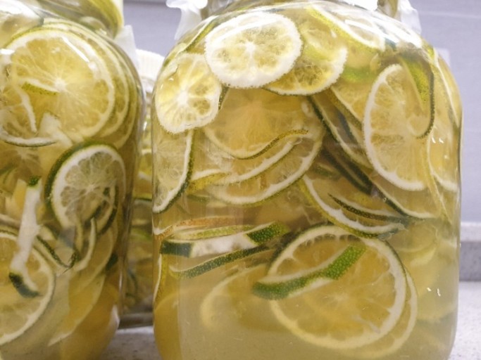 유리볼에서 믹스한 청귤은 열탕 소독한 유리병에 담아 준다. 이때 입구 끝까지 담는 게 아니라 7부에서 8부 정도만 담아 준다. 발효했을 때의 공간이 있어야 하기 때문이다.