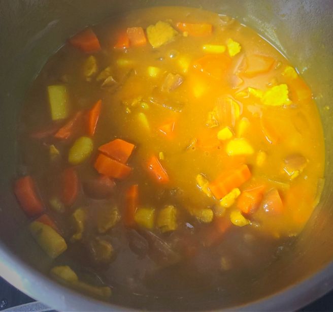 - 센불에서 끓이다가 카레소스가 끓어오르면 저어가면서 3분간 끓이다가 중불로 줄여주고 앞서 볶아놓았던 크래미를 넣고 잘 섞어 줘요.