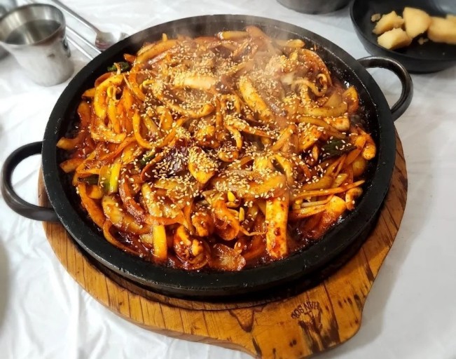 - 완성된 오징어볶음을 그릇에 내놓습니다.