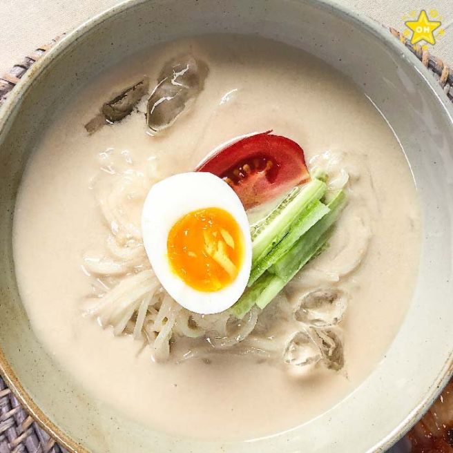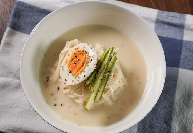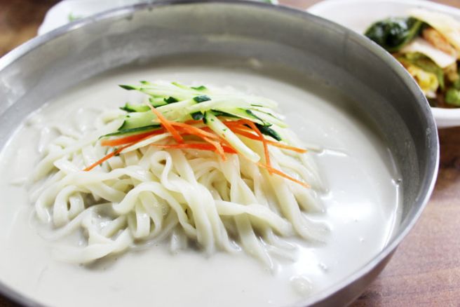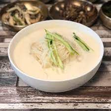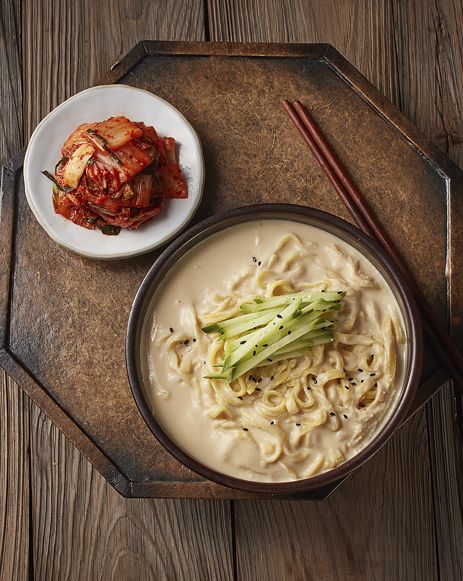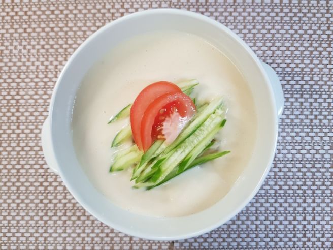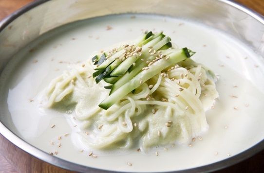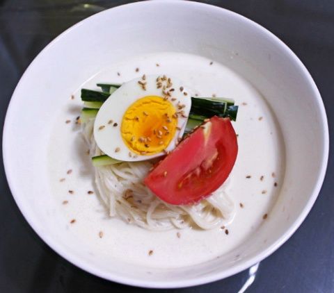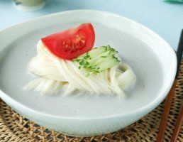 - 면을 삶아 얼음물에 헹구고, 그릇에 담아 콩국물을 붓고 오이, 토마토 등 고명을 올린다.
