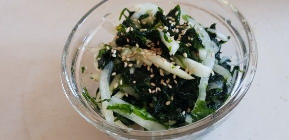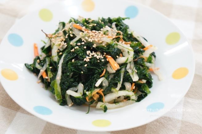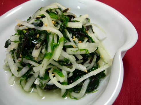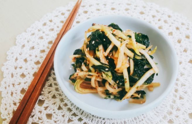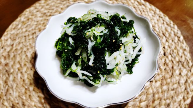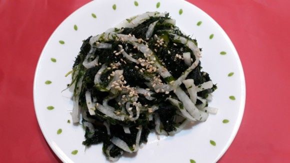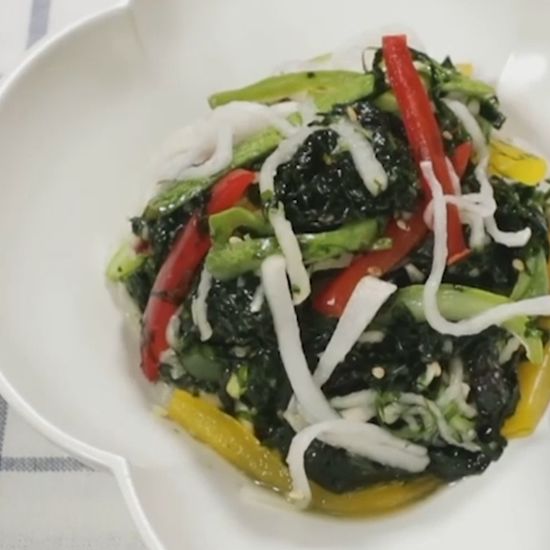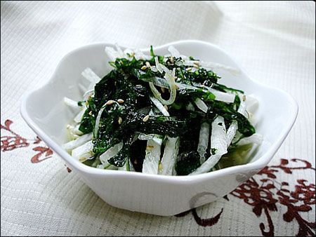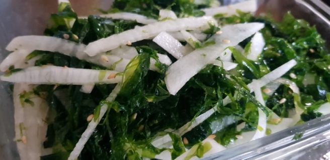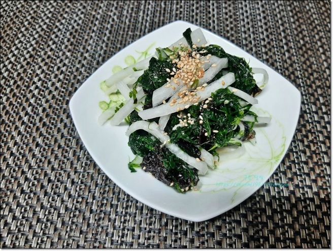 - 준비한 무에 설탕, 소금, 식초를 넣고 잘 섞은 후, 파래와 함께 버무립니다. 비닐장갑을 끼고 조심스럽게 찢어주듯 섞어줍니다.