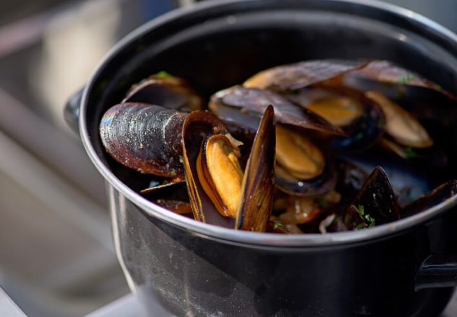 - 냄비에 찬물 1리터를 붓고 홍합 2kg을 넣고 센 불에서 3분간 삶아줘요.